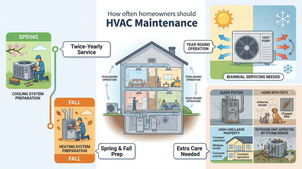 Most HVAC systems should be professionally serviced twice per year, with spring cooling prep and fall heating prep as the two primary windows. Scheduling during the shoulder seasons also means better technician availability and shorter wait times before peak demand hits.